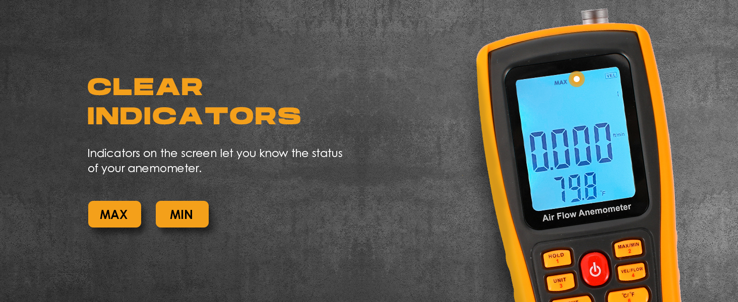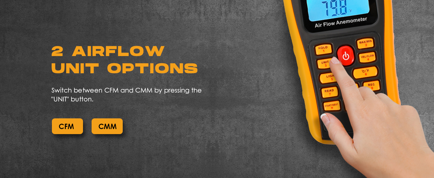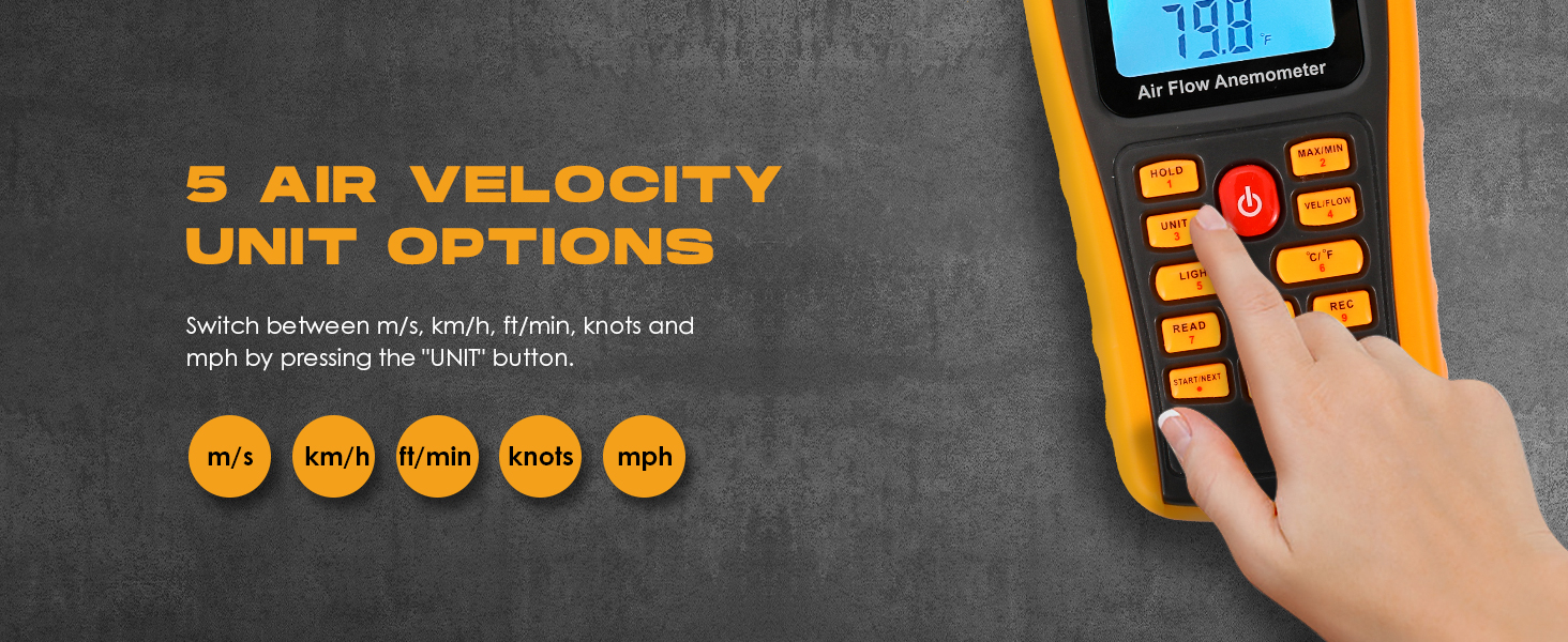 - Ideal Choice: This anemometer measures Air Velocity (m/s, km/h, ft/min, knots, mph), Airflow (CFM/CMM) and Temperature (℃/℉). And provides Windchill, Max, Min, 2/3 Max, Average wind velocity and Airflow readings. CE/FCC/ROHS certified.