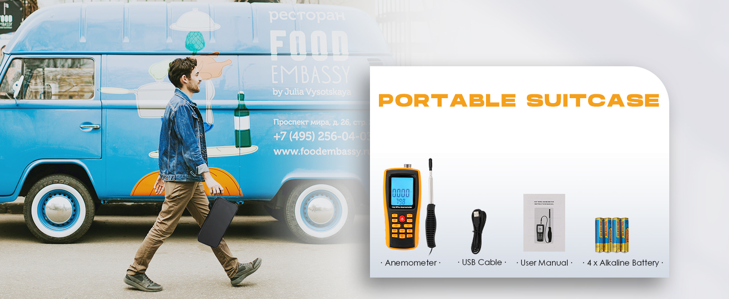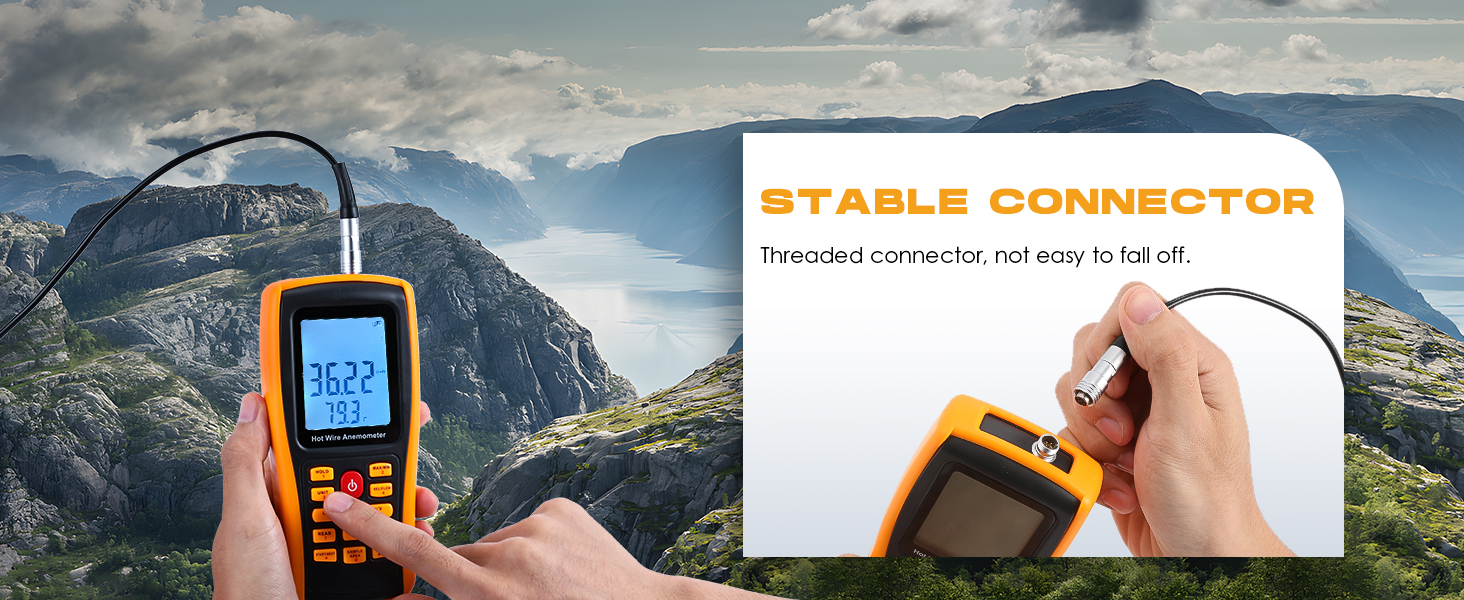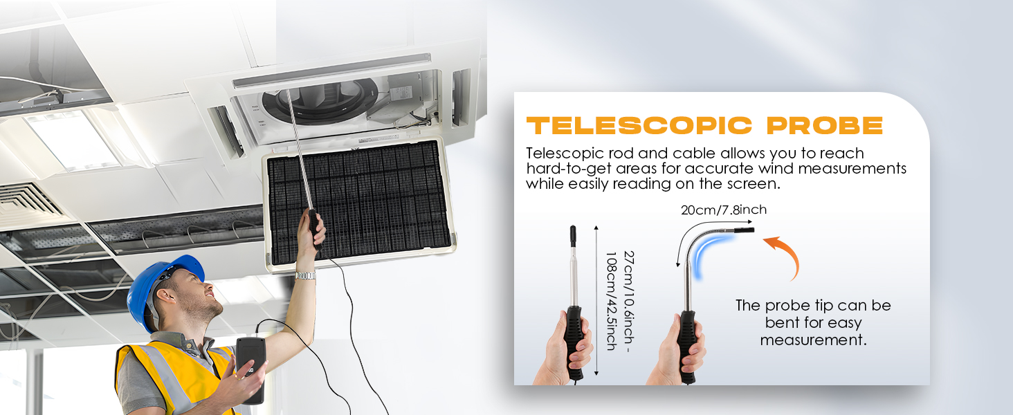 - 2m Long Probe: 1.08m long telescopic rod and 1m long cable. The probe tip can be bent for easy measurement. And comes with an orange protective case to better protect the anemometro.