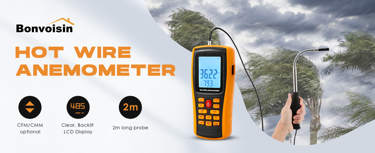 Bonvoisin Hotwire Anemometer Handheld CFM/CMM Air Flow Velocity Meter Wind Speed Gauges with Backlight LCD Display for HVAC in-Duct Airflow Air Velocity Temperature(Thermal Anemometer)