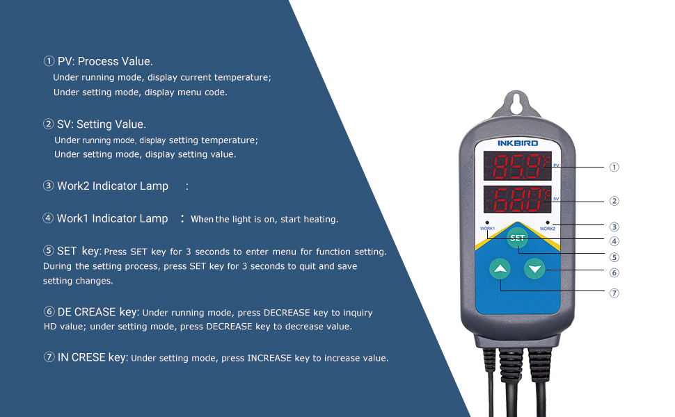 - Dual Display Windows: Display the measured temperature and set temperature at the same time; Temperature calibration, over-temperature and sensor fault alarm; Maximum output load 1200 W (110 V)