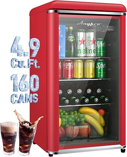 4.9 Cu.Ft Retro Small Beverage Refrigerator Cooler with Double Tempered Glass Door, 120 Can Wine Drink Beer Mini Fridge for Office Bedroom Bar with 7 Temperatures, Adjustable Shelves, Red