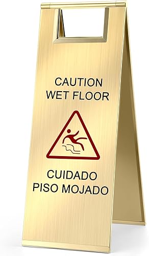Stainless Steel Wet Floor Caution Sign Bulk 8.8 Pound Portable Foldable Handle Bilingual Safety Sign for Kitchen Restaurant Supermarket Shop Commercial Use Avoid Fall and Slip Accident(Gold)